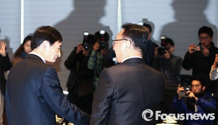 (서울=포커스뉴스) 15일 오후 서울 중구 은행회관에서 유일호(오른쪽) 경제부총리와 이주열 한국은행 총재가 오찬 회동에 앞서 악수를 하고 있다.