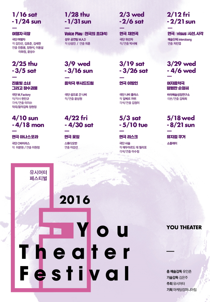 4월과 5월에는 분단과 탈북 이후 더불어 살아가는 사연을 가진 실화를 바탕으로 다룬 극단 C바이러스의 '연극 아나스포라', 작가 라본드 뮬러가 일본에 체류하던 중 우연희 위안부에 대한 이야기를 듣고 상상력을 발휘해 쓴 '특급호텔'을 공연화 한 스튜디오 반의 '연극 꽃잎', 한국에서 한 번도 소개되지 않은 이탈리아 에두아르도 데 필리포의 작품을 공연화 한 극단 사슬의 '연극 리스크' 등이 공연된다. 페스티벌 지원 단체의 공연 이후에는 지난해 중년여성들의 공감을 얻으며 인기를 모았던 '뮤지컬 쿠거'가 공연될 예정이다.'2016 유시어터 페스티벌' 포스터. <사진제공=마케팅컴퍼니아침>