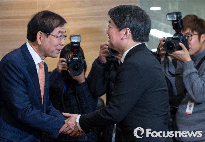(서울=포커스뉴스) 15일 오후 서울 노원구청 대강당에서 열린 2016 노원구 신년인사회에 참석한 박원순(왼쪽) 서울시장과 안철수 국민의당 인재영입위원장이 악수하고 있다.
