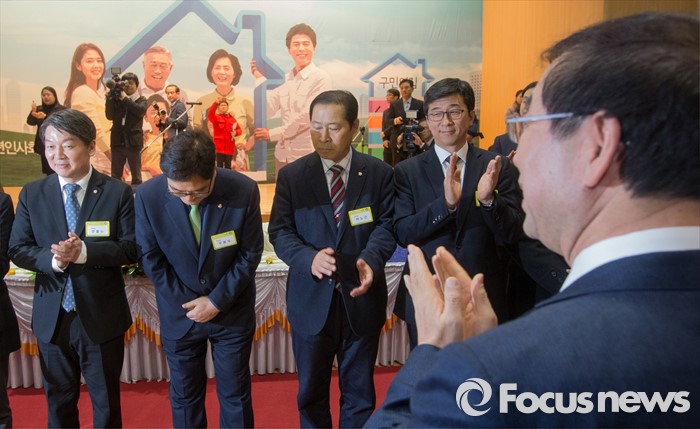 (서울=포커스뉴스) 15일 오후 서울 노원구청 대강당에서 열린 2016 노원구 신년인사회에 참석한 박원순(맨 오른쪽) 서울시장이 안철수(맨 왼쪽) 국민의당 인재영입위원장 및 의원들에게 박수를 보내고 있다.