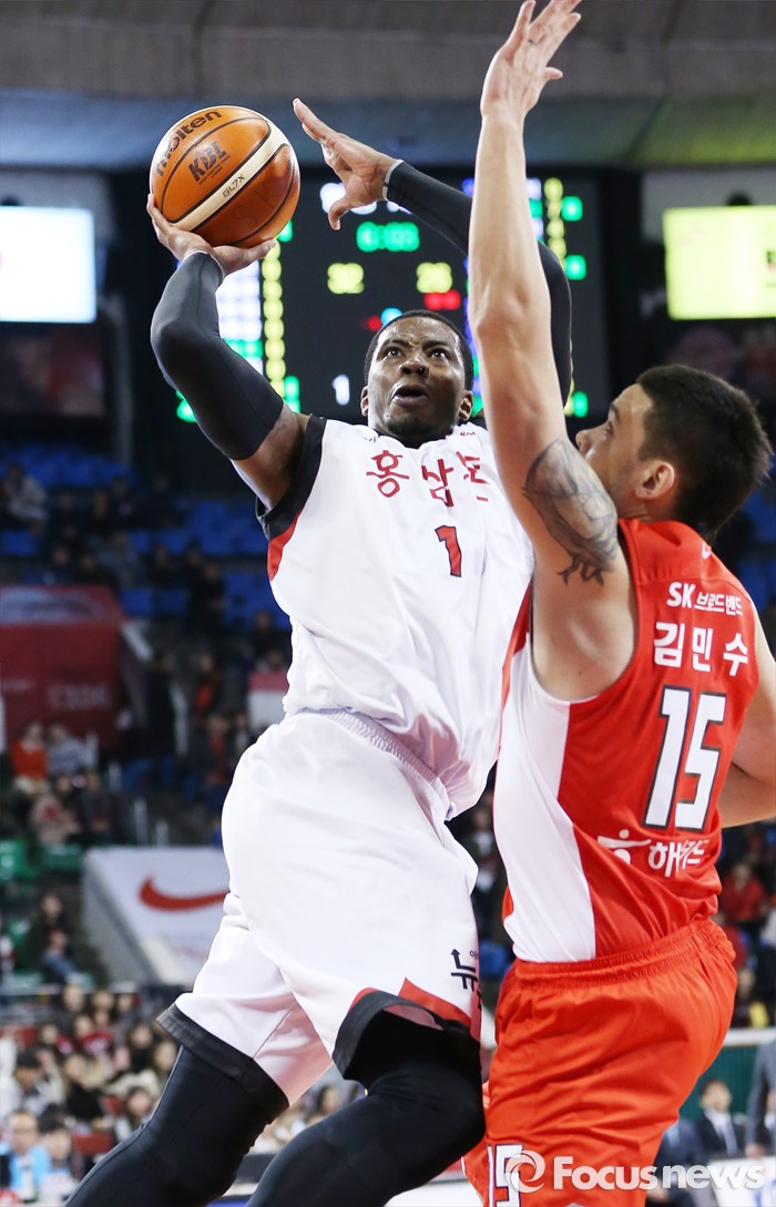 (서울=포커스뉴스) 15일 서울 잠실학생체육관에서 열린 2015-2016 프로농구 SK-KGC 경기에서 KGC 찰스 로드가 SK 김민수의 마크를 받으며 점프슛을 하고 있다.