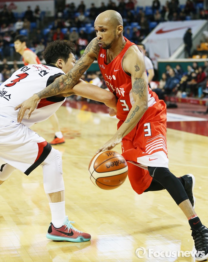 (서울=포커스뉴스) 15일 서울 잠실학생체육관에서 열린 2015-2016 프로농구 SK-KGC 경기에서 KGC 이정현이 SK 스펜서의 대시를 팔꿈치로 견제하고 있다.