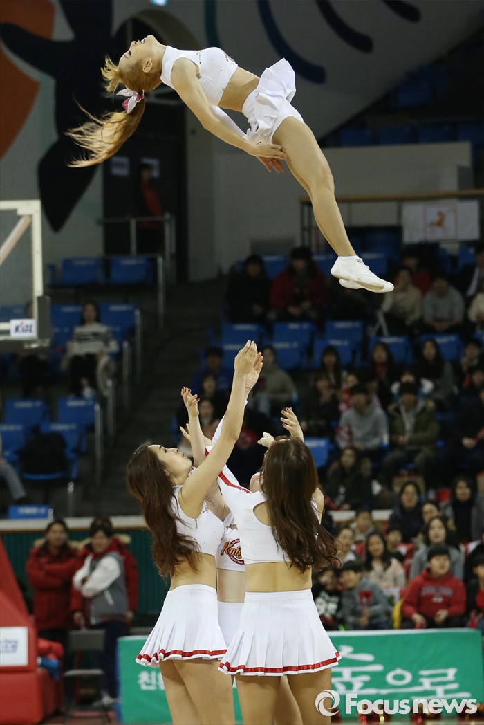 (서울=포커스뉴스) 15일 서울 잠실학생체육관에서 열린 2015-2016 프로농구 SK-KGC 경기에서 SK 치어리더가 경기 시작전 코트의 분위기를 끌어 올리는 스턴트 치어리딩을 공연하고 있다.