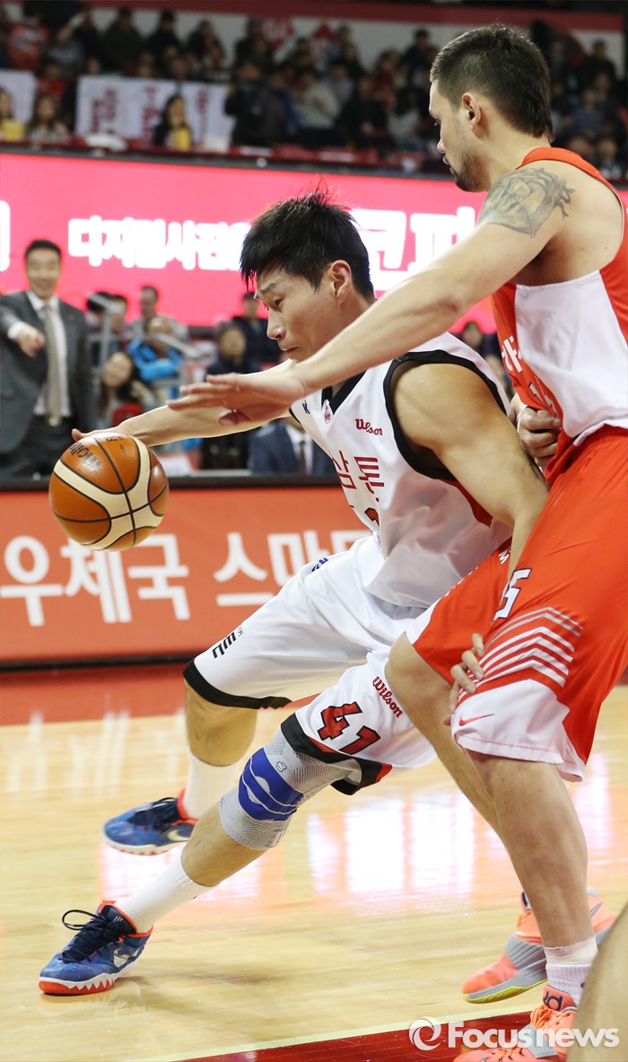 (서울=포커스뉴스) 15일 서울 잠실학생체육관에서 열린 2015-2016 프로농구 SK-KGC 경기에서 KGC 오세근이 SK 김민수를 등지며 골밑 돌파를 노리고 있다.