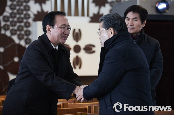 (서울=포커스뉴스) 노회찬 전 국회의원(왼쪽)과 이재정 경기도교육감이 16일 오후 故 신영복 성공회대 석좌교수의 빈소가 마련된 서울 구로구 성공회대학교 성미가엘성당에서 손을 맞잡고 있다. <성공회대학교 제공>