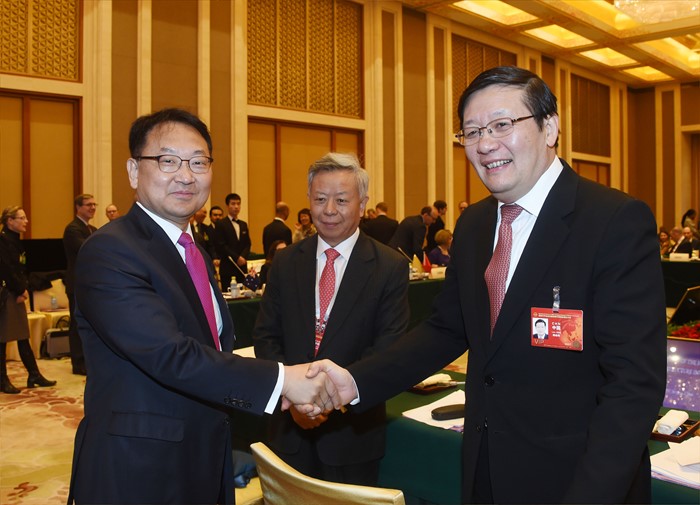 (북경=포커스뉴스) 유일호 부총리 겸 기획재정부 장관이 16일 중국 북경 조어대에서 열린 아시아 인프라 투자은행(AIIB) 창립총회에 참석, 러우 지웨이 중국 재무장관과 악수하며 인사를 나누고 있다. <사진제공=기획재정부>
