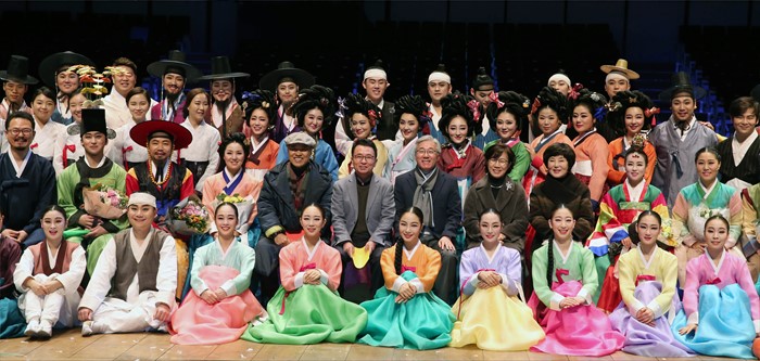 (서울=포커스뉴스) 김종덕 문화체육관광부 장관이 안호상 국립극장장 등 관계자들과16일 서울 국립극장에서 선보인 극장형 마당놀이 ‘춘향이 온다’를 관람하고 배우들을 격려하고 기념촬영하고 있다. <사진제공=문화체육관광부>