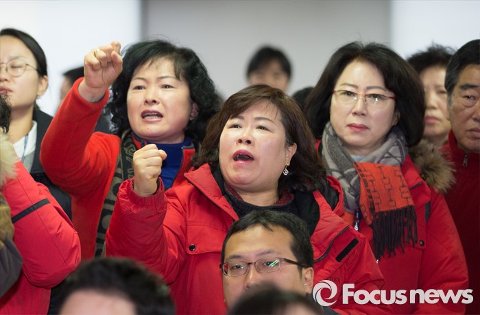 (서울=포커스뉴스) 안대희 전 대법관이 17일 서울 여의도 새누리당사에서 열린 기자회견에서 제 20대 총선 마포갑 출마를 공식 선언을 하자 강승규 마포갑 당협위원장을 비롯한 지지자들이 거세게 항의하고 있다.