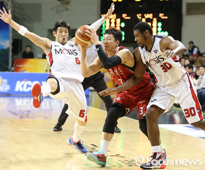 (안양=포커스뉴스) 17일 안양실내체육관에서 열린 2015-2016 프로농구 KGC-모비스 경기에서 KGC 3점 슈터인 이정현을 모비스 양동근과 빅터가 필사적으로 저지하고 있다.