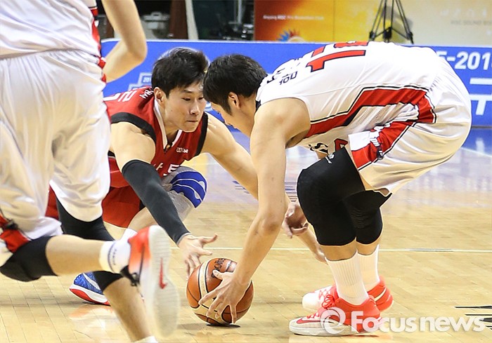 (안양=포커스뉴스) 17일 안양실내체육관에서 열린 2015-2016 프로농구 KGC-모비스 경기에서 KGC 오세근과 모비스 함지훈이 튄 공을 잡으려 달려들고 있다.