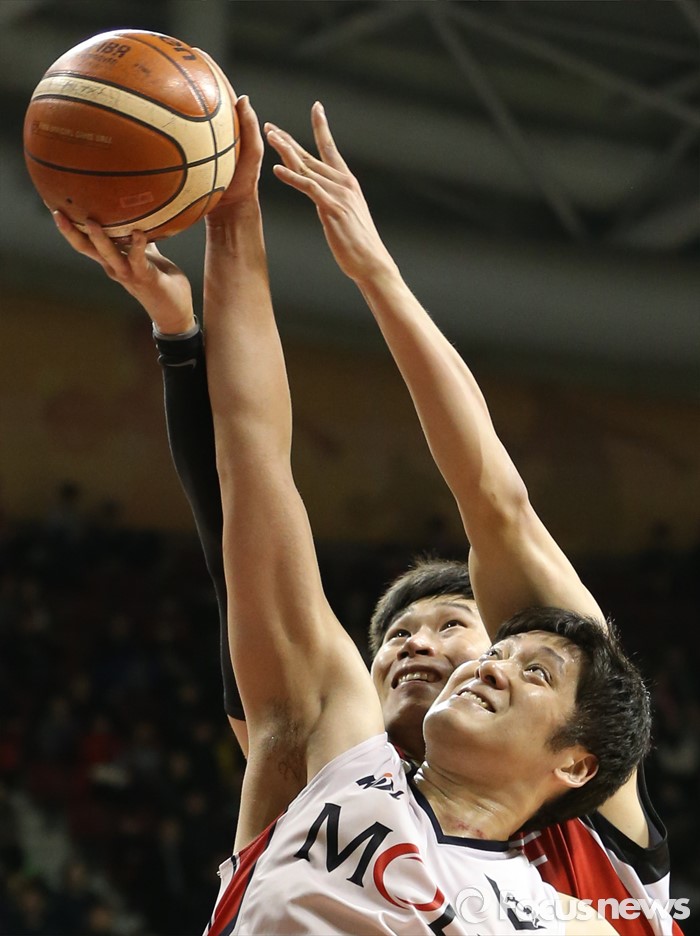 (안양=포커스뉴스) 17일 안양실내체육관에서 열린 2015-2016 프로농구 KGC-모비스 경기에서 모비스 함지훈(앞)과 KGC 오세근이 치열하게 리바운드 다툼을 하고 있다.