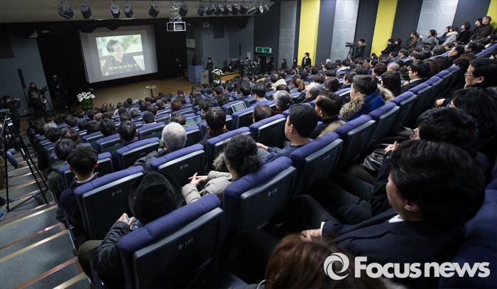 (서울=포커스뉴스) 17일 밤 서울 구로구 성공회대학교에서 열린 '신영복 교수 추모의 밤' 행사에 시민들이 모여 신영복 교수를 기리고 있다.