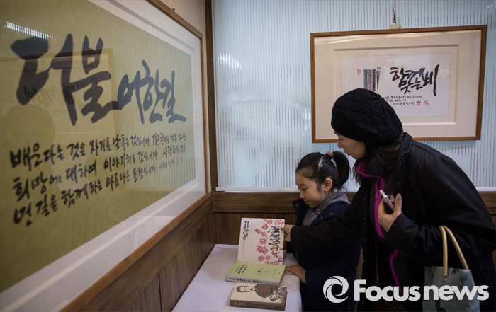 (서울=포커스뉴스) 17일 오후 서울 구로구 성공회대학교에 마련된 故 신영복 성공회대 석좌교수 추모전시관을 찾은 어느 한 모녀가 고인의 작품을 감상하고 있다.