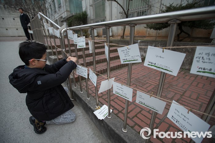 (서울=포커스뉴스) 17일 오후 서울 구로구 성공회대학교 대학성당에 차려진 故 신영복 성공회대 석좌교수의 빈소 주위에 한 소년이 신영복 교수를 추모하는 엽서를 붙이고 있다.