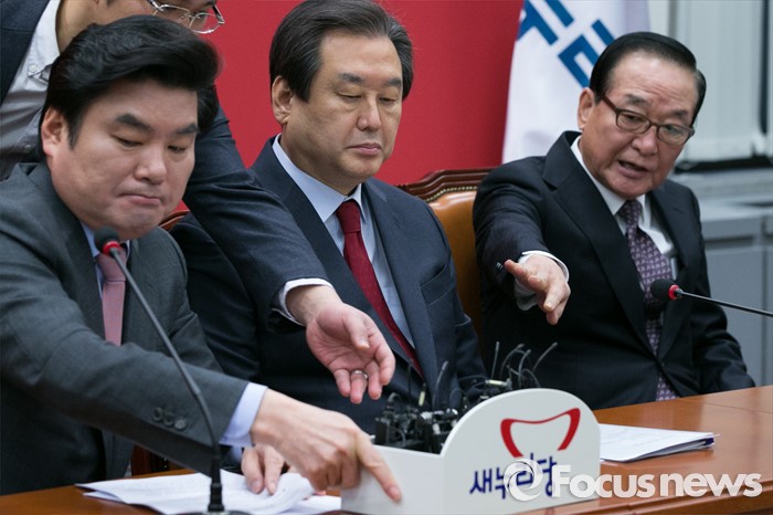 (서울=포커스뉴스) 새누리당 서청원(오른쪽부터) 최고위원, 김무성 대표, 원유철 원내대표가 18일 오전 서울 여의도 국회에서 열린 최고위원회의에 참석해 마이크를 넘기고 있다.