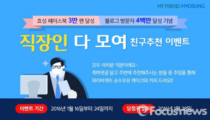 (서울=포커스뉴스) 효성은 자사의 페이스북 팬 수 3만 돌파와 블로그 방문자 수 400만 돌파를 기념하기 위해 오는 24일까지 ‘SNS 친구 추천 이벤트’를 연다고 18일 밝혔다.