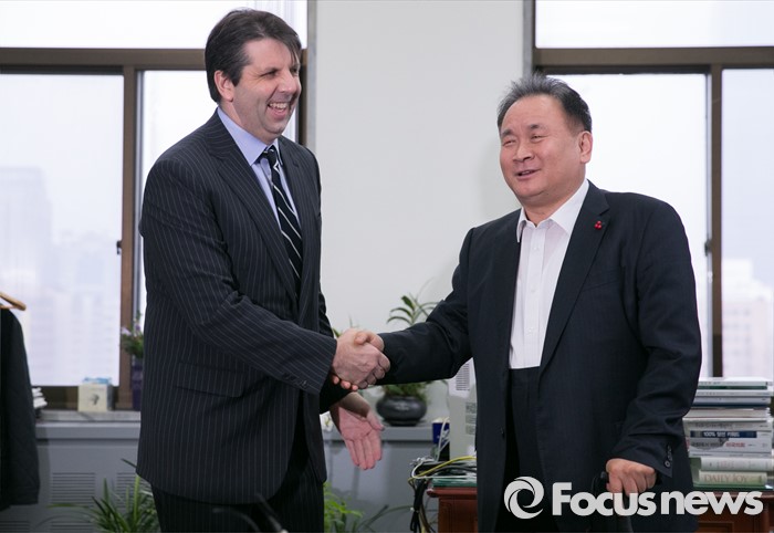 (서울=포커스뉴스) 이상민(오른쪽) 법제사법위원장이 18일 오전 서울 여의도 국회 위원장실에서 4개국 외교사절(미국, 영국, 호주, EU)을 대표해 방문한 마크 리퍼트 주한미국대사와 외국법자문사법 개정안과 관련 논의에 앞서 인사하고 있다.