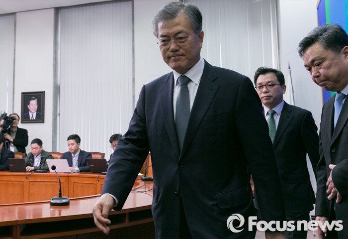 (서울=포커스뉴스) 문재인(왼쪽 두번째) 더불어민주당 대표가 18일 오전 서울 여의도 국회에서 오성규(오른쪽 두번째) 전 서울시설관리공단 이사장과 김민영(오른쪽 첫번째) 전 참여연대 사무처장 인재영입 기자회견을 마친 뒤 퇴장하고 있다.