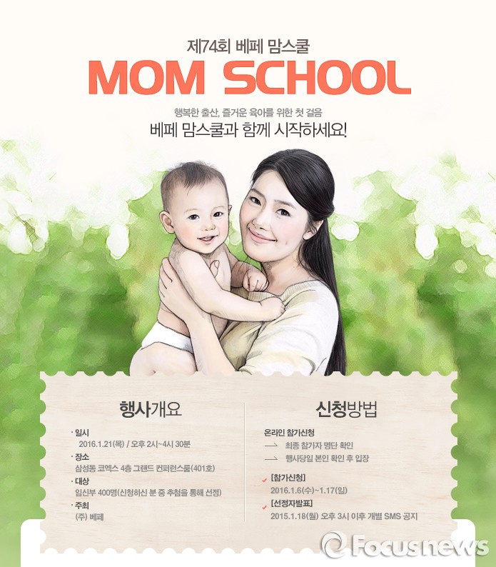 (서울=포커스뉴스) 임신·출산·육아 관련 브랜드인 베페는 오는 21일 서울 삼성동 코엑스 4층 그랜드 컨퍼런스룸에서 '제74회 베페 맘스쿨'을 개최한다.
