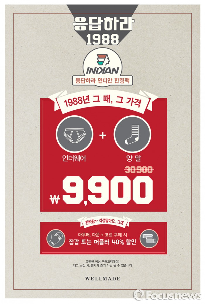 이외에도 다운이나 코트 제품을 구매하는 고객에게 머플러와 장갑을 40% 할인된 가격에 판매한다.웰메이드의 '응답하라 인디안팩' 프로모션 포스터. <사진제공=웰메이드>