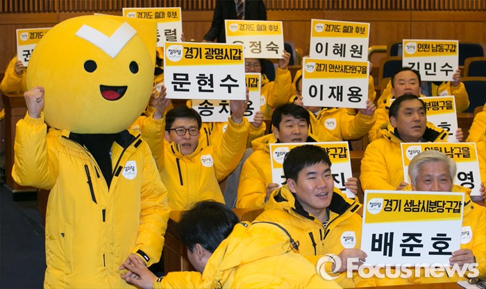(서울=포커스뉴스) 18일 오전 서울 여의도 국회 헌정기념관에서 열린 정의당 2016 총선 수도권 후보 발대식에 참석한 심상정 상임대표 등 후보들이 자신의 이름이 적힌 피켓을 들고 총선 승리를 다짐하고 있다.