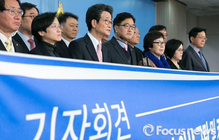 (서울=포커스뉴스) 이목희(앞줄 왼쪽 세번째) 더불어민주당 정책위의장을 비롯한 전국직능대표자회의 대표들이 18일 오전 서울 여의도 국회 정론관에서 카드수수료 기습인상 규탄 및 카드수수료 1%법 통과를 촉구하는 기자회견을 하고 있다.