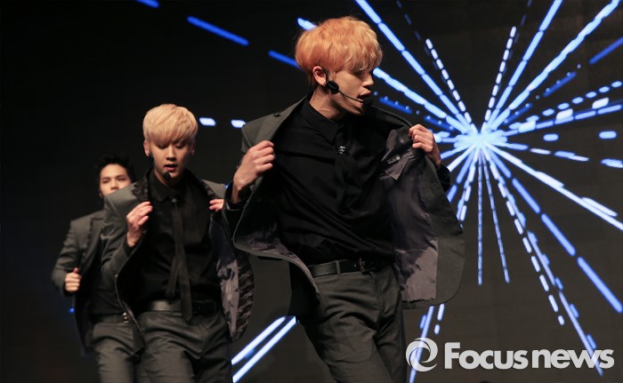 (서울=포커스뉴스) 18일 오전 서울 강남구 일지아트홀에서 열린 아이돌 그룹 틴탑의 미니앨범 'RED POINT' 쇼케이스에 참석한 멤버 니엘(오른쪽 부터) 창조, 캡이 신곡 '사각지대'의 무대를 선보이고 있다.