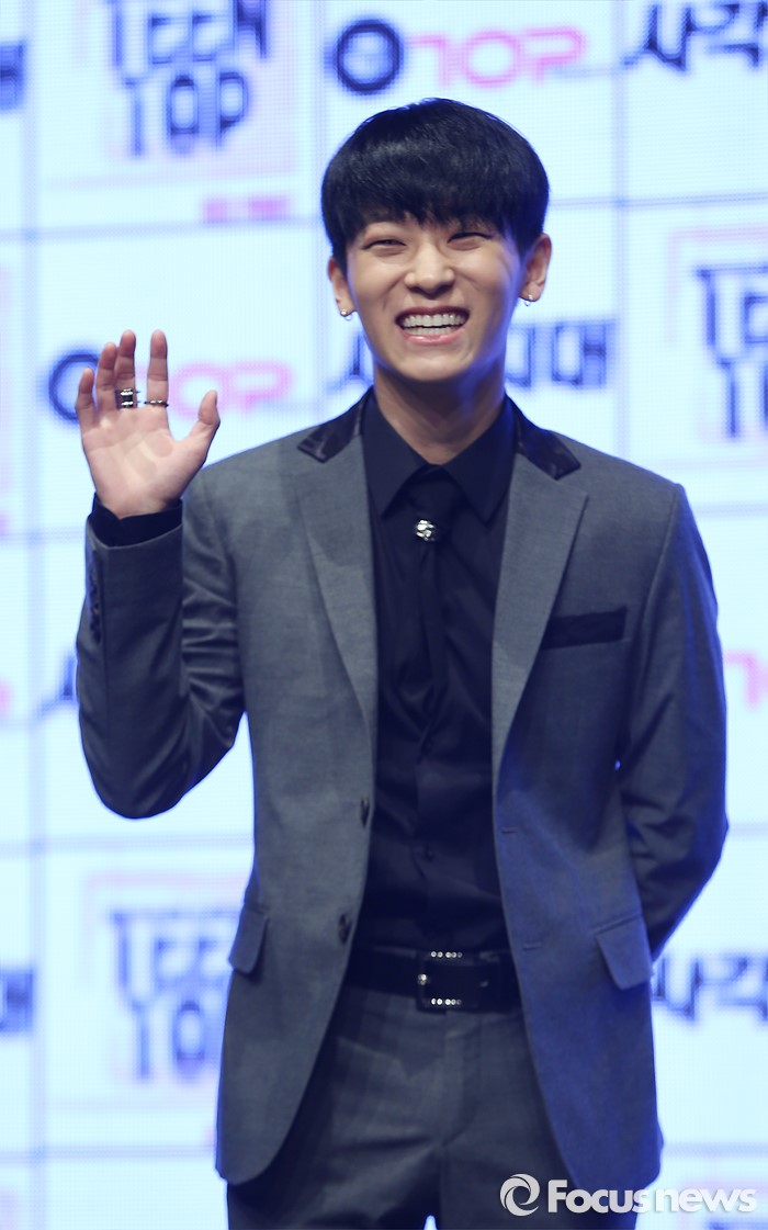 (서울=포커스뉴스) 18일 오전 서울 강남구 일지아트홀에서 열린 아이돌 그룹 틴탑의 미니앨범 'RED POINT' 쇼케이스에 참석한 멤버 엘조가 포토타임을 갖고 있다.