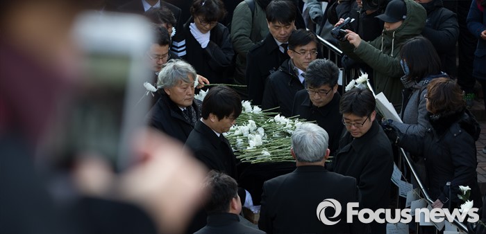 (서울=포커스뉴스) 18일 오후 서울 구로구 성공회대학교에서 엄수된 '故 신영복 석좌교수 영결식'에서 고인의 영정과 유해가 운구되고 있다.