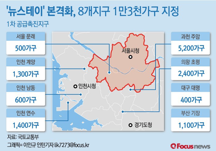 (서울=포커스뉴스)국토부는 뉴스테이 공급을 활성화 하기 위해 1차 공급촉진지구로 ▲서울 문래(500가구) ▲대구 대명(400가구) ▲의왕 초평(2400가구) ▲과천 주암(5200가구) ▲부산 기장(1100가구) ▲인천 계양(1300가구) ▲인천 남동(600가구) ▲인천 연수(1400가구) 등 8곳(1만2900가구)를 선정했다.