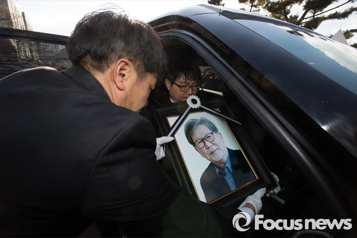 (서울=포커스뉴스) 18일 오후 서울 구로구 성공회대학교 대학성당에서 故 신영복 석좌교수 영결식이 끝나고 고인의 영정과 유해가 운구되고, 영정은 교수실을 들려 차량으로 향하고 있다.
