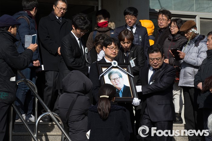 (서울=포커스뉴스) 18일 오후 서울 구로구 성공회대학교 대학성당에서 故 신영복 석좌교수 영결식이 끝나고 고인의 영정과 유해가 운구되고, 영정은 교수실을 들려 차량으로 향하고 있다.