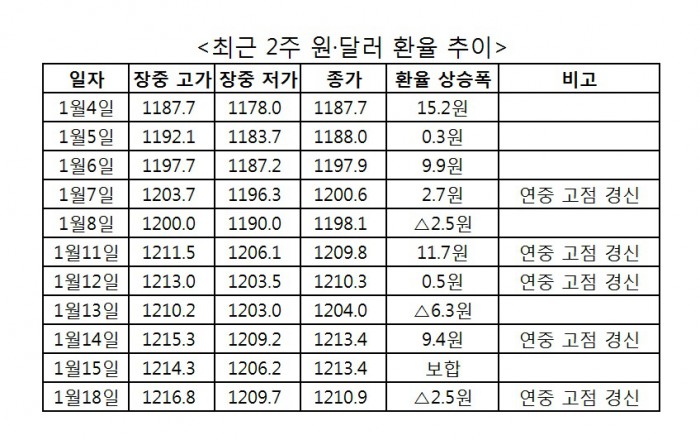 하지만 올해는 다르다. 1월 7일(1203.7원) 1월 11일(1211.5원) 1월 12일(1213.0원) 1월 14일(1215.3원) 1월 18일 (1216.8원) 등 원·달러 환율의 고점은 지속적으로 높아지고 있다. 외환선물업계에서 심리적 저항선이라고 불렸던 1200원, 1210원대가 짧은 시간 내 깨졌다.