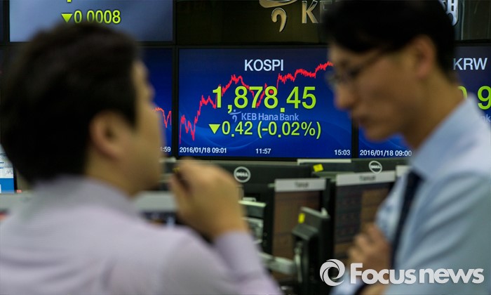 (서울=포커스뉴스) 코스피 지수가 중국 경제에 대한 불안감과 국제유가 하락 등의 여파로 전 거래일 대비 0.42포인트(0.02%) 하락한 1878.45로 마감한 18일 오후 서울 중구 KEB하나은행 딜링룸에서 딜러들이 업무를 보고 있다. 이날 원달러 환율은 전 거래일보다 1.5원 하락한 1,210.9원, 원위안 환율은 전거래일보다 0.63원 오른 183.93원에 장을 마쳤다.