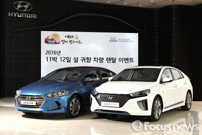 현대차는 홈페이지 응모 고객 중 추첨을 통해 총 550명을 선정, 아반떼는 29일, 아이오닉 하이브리드는 다음달 2일에 홈페이지를 통해 당첨자를 공지할 예정이다.현대자동차는 고객들의 성원에 대한 감사의 뜻을 전하고 희망찬 2016년을 기원하고자 '현대자동차 11박 12일 설 귀향 차량 렌탈 이벤트'를 진행한다. <사진제공=현대자동차>