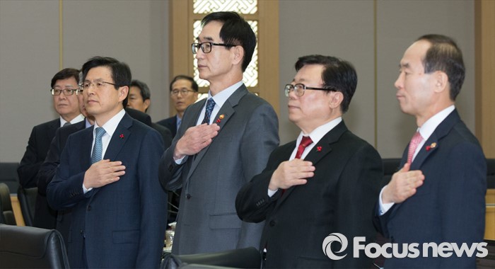 (세종=포커스뉴스) 황교안 국무총리와 국무위원들이 19일 오전 세종시 정부세종청사 국무회의장에서 열린 청와대-세종청사 영상 국무회의에 참석해 국기에 대한 경례를 하고 있다.