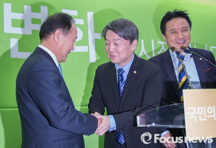 (서울=포커스뉴스) 국민의당(가칭)에 새롭게 합류한 김봉수 전 키움증권 부회장이 19일 오전 서울 마포구 국민의당 당사에서 안철수 인재영입위원장과 인사를 나누고 있다.