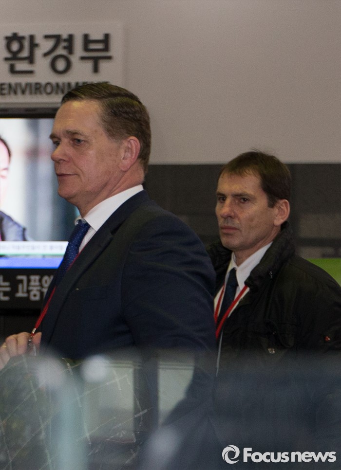 (세종=포커스뉴스) 요하네스 타머(왼쪽) 아우디폭스바겐코리아 사장과 프리드리히 요한 아이히러 독일 폭스바겐 파워트레인 총괄책임자 등 독일본사 직원들이 19일 오전 세종시 정부세종청사 환경부 교통환경과에서 결함시정 관련 기술적 내용을 설명하고 환경부를 나서고 있다.