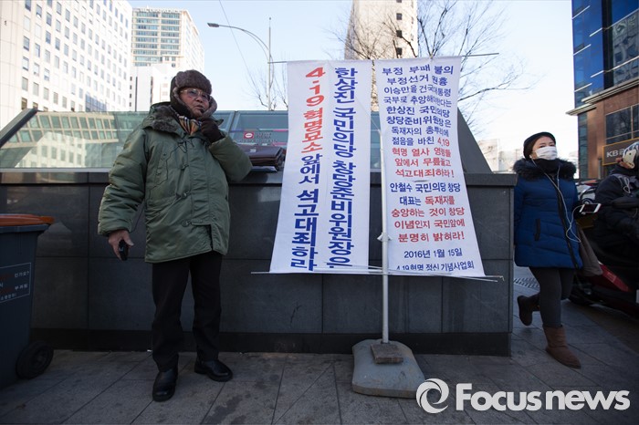 (서울=포커스뉴스) 19일 서울 마포구 일신빌딩 국민의당 당사 앞에서 419혁명정신기념사업회 관계자가 한상진 국민의당 창당준비위원장의 사과를 촉구하며 1인 시위를 하고 있다.