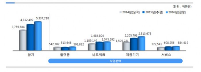 19일 미래창조과학부가 발표한 '2015년 사물인터넷 산업 실태조사'에 따르면 지난해 사물인터넷 시장 매출액이 4조8125억원으로 전년(3조7597억원)에 비해 28% 증가했다. 사업 분야별로는 제품기기 분야의 매출액이 약 2조2058억원으로 가장 높은 비율(45.8%)을 차지했으며, 네트워크 분야의 매출액이 1조4848억원(30.9%)으로 뒤를 이었다.