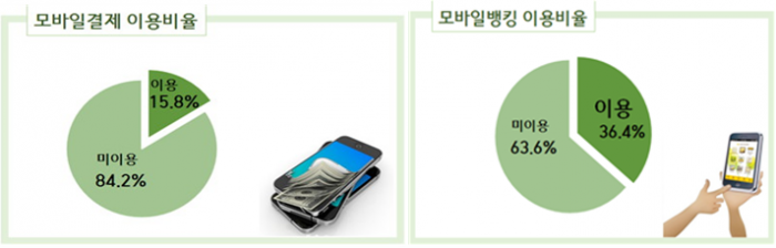 모바일금융서비스 이용시 개인정보 보호 정도는 모바일뱅킹이 44.7점, 모바일결제 42.6점으로 모바일뱅킹이 다소 높았으나 모두 50점 미만(100점 만점)으로 전체적 신뢰도는 미흡한 수준인 것으로 평가됐다.모바일결제 및 모바일뱅킹 이용비율 <자료출처=한국은행>
