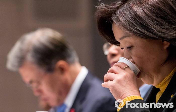 남북관계란 주제로 열린 '2016 신년토론회'에 참석해 물을 마시고 있다.