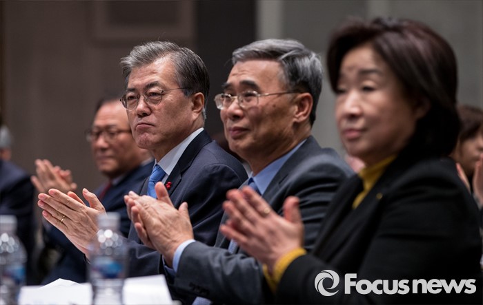 (서울=포커스뉴스) 문재인(오른쪽 세 번째)더불어민주당 대표와 심상정(오른쪽) 정의당 상임대표가 19일 오후 서울 중구 프레스센터 국제회의장에서 20대 총선과 남북관계란 주제로 열린 '2016 신년토론회'에 참석해 박수 치고 있다.