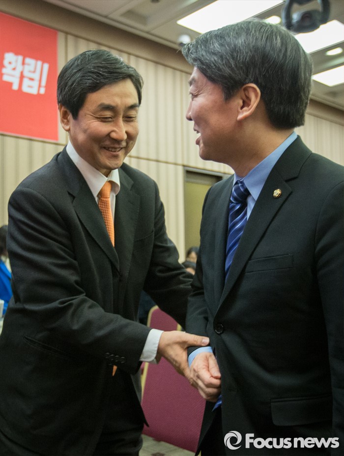 (서울=포커스뉴스) 국민의당(가칭) 안철수 의원과 더불어민주당 이종걸 원내대표가 19일 오후 서울 중구 은행회관 국제회의실에서 열리는 금융노조 제51차 정기전국대의원대회에 참석하고 있다.