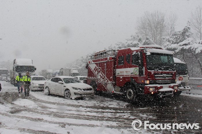 (서울=포커스뉴스) 19일 오후 12시 48분께 전북 정읍시 북면 남산리 호남고속도로 내장산IC와 태인IC 사이에서 차량 30여대가 추돌하는 사고가 발생해 경찰, 소방관, 도로공사 직원들이 사고 수습작업을 하고 있다.
