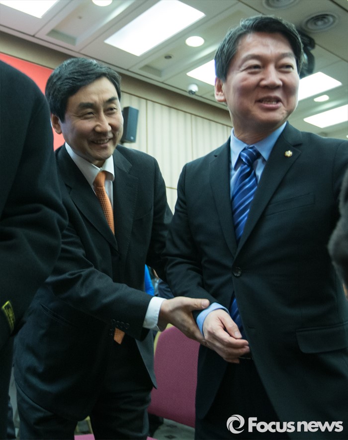 (서울=포커스뉴스) 국민의당(가칭) 안철수 의원과 더불어민주당 이종걸 원내대표가 19일 오후 서울 중구 은행회관 국제회의실에서 열리는 금융노조 제51차 정기전국대의원대회에 참석하고 있다.
