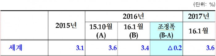 미국(2.8%→2.6%)은 달러 강세에 따른 제조업부문 경쟁력 약화, 저유가로 인한 에너지 산업부문 투자부진 등으로 소폭 감소할 것으로 내다봤다.
