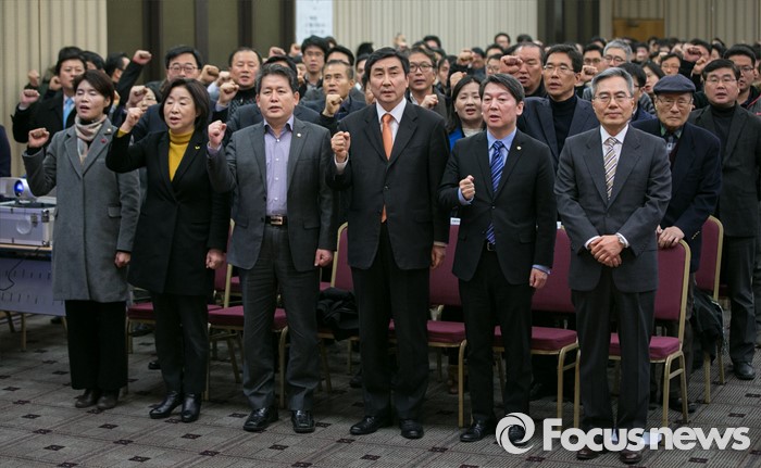 (서울=포커스뉴스)국민의당 안철수 의원과 더불어민주당 이종걸 원내대표, 정의당 심상정 대표가 참석한 가운데 19일 오후 서울 중구 은행회관 국제회의실에서 금융노조 제51차 정기전국대의원대회가 열리고 있다. (왼쪽 두 번째부터) 정의당 심상정 대표, 더불어민주당 김경협 의원, 더불어민주당 이종걸 원내대표, 국민의당 안철수 의원.