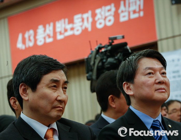 (서울=포커스뉴스) 국민의당(가칭) 안철수 의원(오른쪽)과 더불어민주당 이종걸 원내대표가 19일 오후 서울 중구 은행회관 국제회의실에서 열린 금융노조 제51차 정기전국대의원대회에 참석해 나란히 앉아 있다.