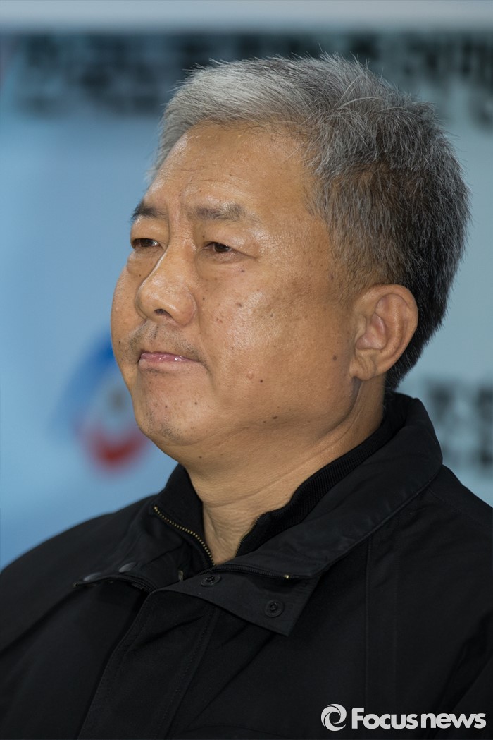 (서울=포커스뉴스) 김동만 한국노총 위원장이 19일 오후 서울 영등포구 한국노동조합총연맹에서 열린 노사정합의 파기 선언 한국노총 기자회견 시작 전 자리에 앉아 있다.